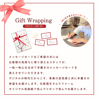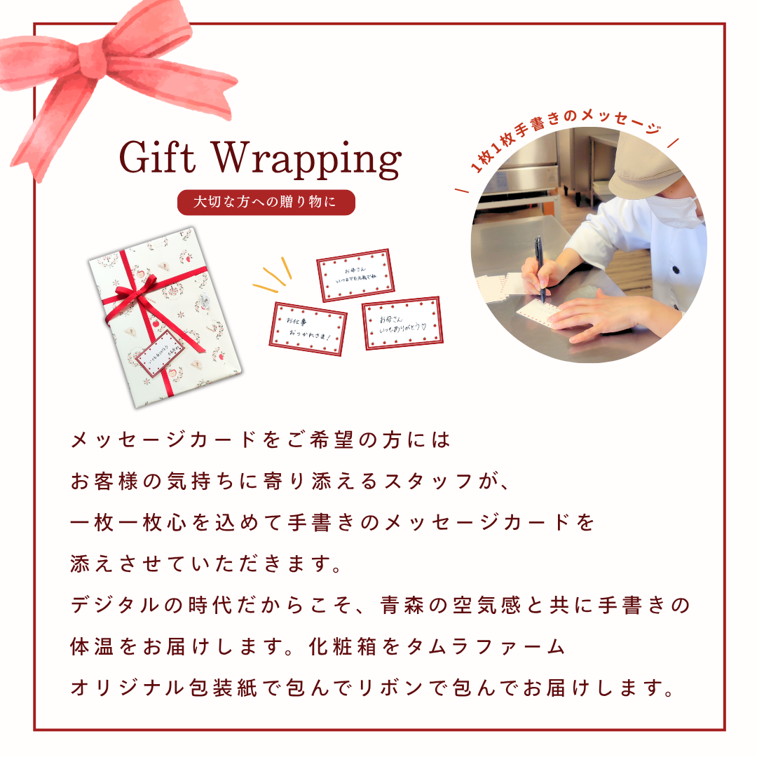 メッセージカードはスタッフが1枚ずつ心を込めて手書きいたします。デジタルの時代だからこそ、青森の空気感と共に、手書きの体温をお届けします。